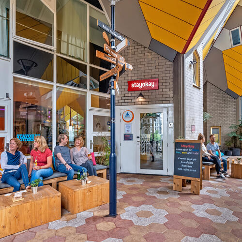 Das Hostel befindet sich in den auffälligen Kubuswohnungen. Zwischen den Kuben befinden sich Innenhöfe. Wenn du nach oben gehst, läufst du zwischen den Kubuswohnungen über die zahlreichen Innenhöfe nach oben. Dann gelangst du automatisch zu Stayokay, Nummer 85. Mach sich keine Sorgen, folg einfach dem Weg nach oben, und schon bist du da!